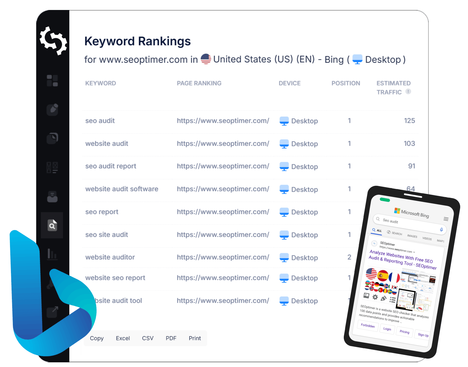 SEOptimer’s Bing Keyword Tracker also lets you track rankings on Bing Mobile, in addition to Bing Desktop Search.