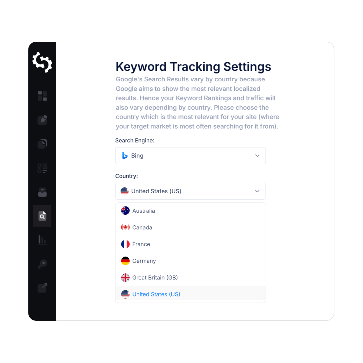 SEOptimer’s Bing Rank Tracker allows you to choose from 6 countries to more accurately track your Bing SEO efforts.