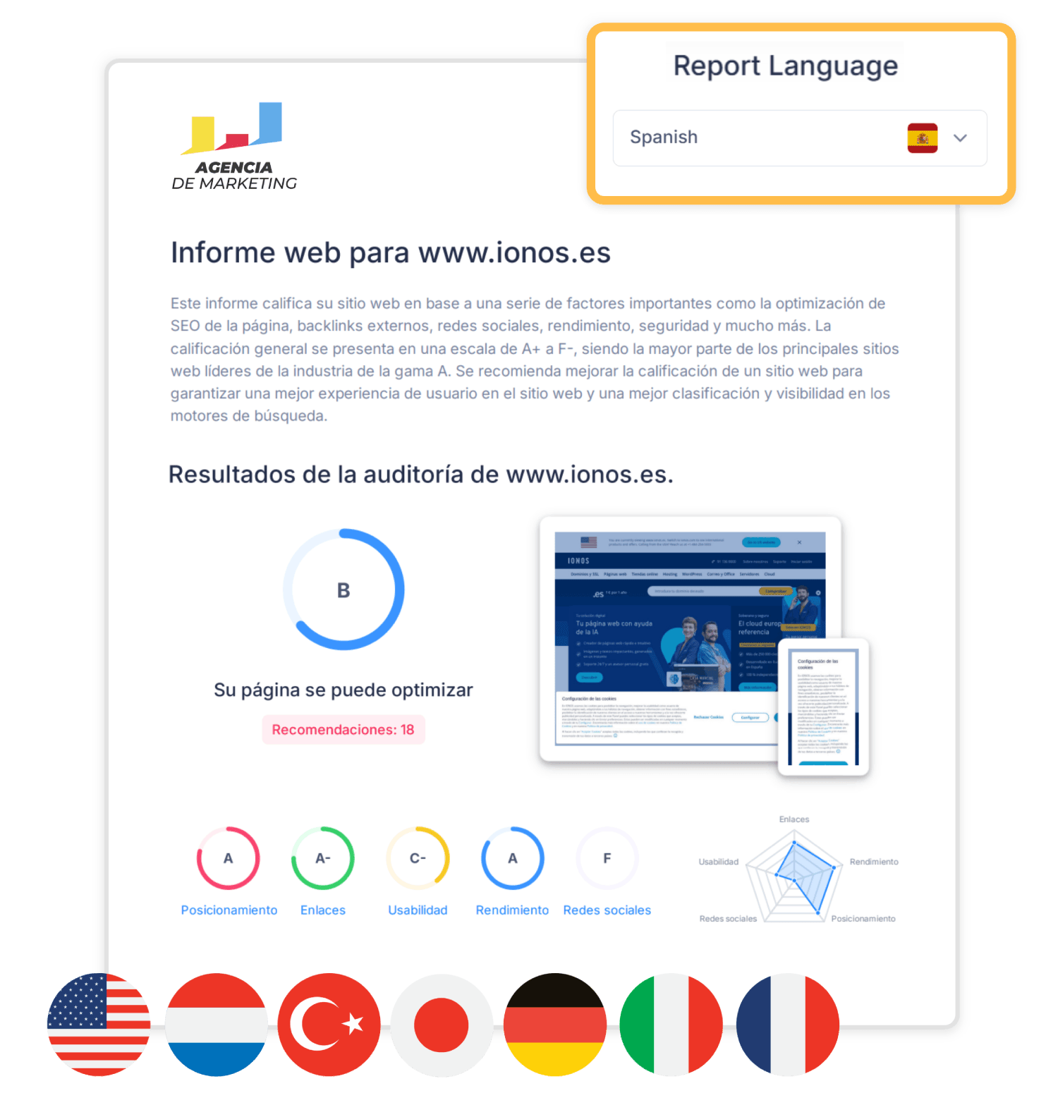 SEOptimer reports have been professionally translated into a variety of languages including:
