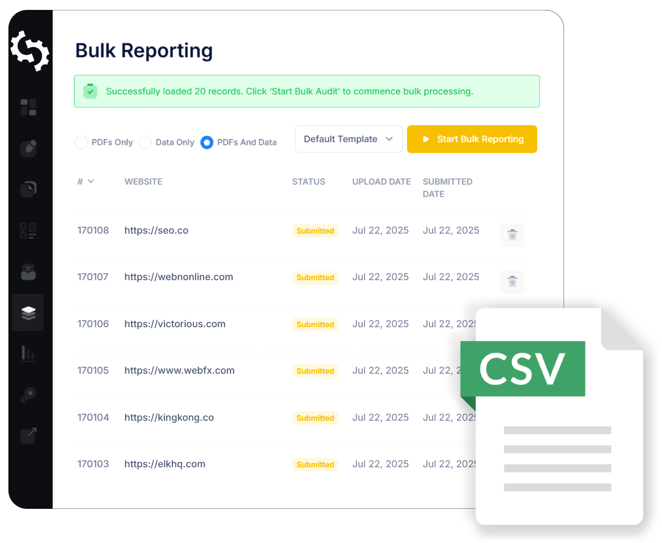 Upload a CSV of hundreds or thousands of website URLs via our Bulk Reporting Interface.
